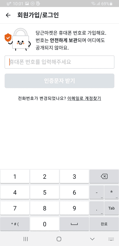 내 동네를 인증한 뒤에 물건을 등록하기 위해서는 당근마켓 회원가입과 로그인 절차가 필요합니다. 회원가입은 휴대폰번호를 입력하고 인증문자를 받으면 간단하게 로그인이 됩니다. 앱을 꺼도 다음에 자동으로 로그인이 되기 때문에 한번만 입력하시면 됩니다.