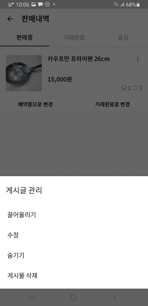 끌어올리기 기능은 내가 등록한 물건 제목 옆에 점 3개 아이콘을 터치면 게시글 관리메뉴가 뜨는데, 여기에서 끌어올리기와 수정, 숨기기, 삭제가 가능합니다.