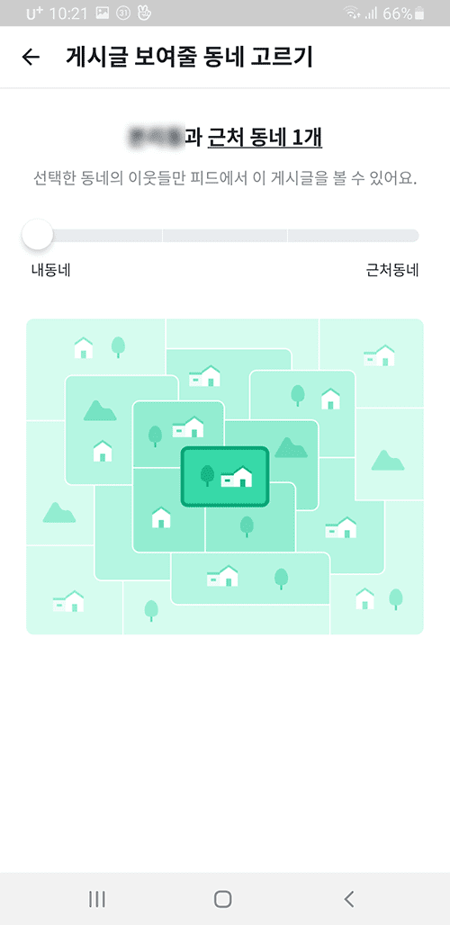 당근마켓에서는 내가 살고있는 동네를 중심으로 어디까지 게시글을 보여줄건지 선택이 가능합니다. 하단에 'ㅇㅇ동과 근처동네 17곳' 이라고 되어 있는 부분을 클릭하면 작게는 내가 살고있는 동네 1개 많게는 근처의 81개의 동네까지 설정이 가능합니다.