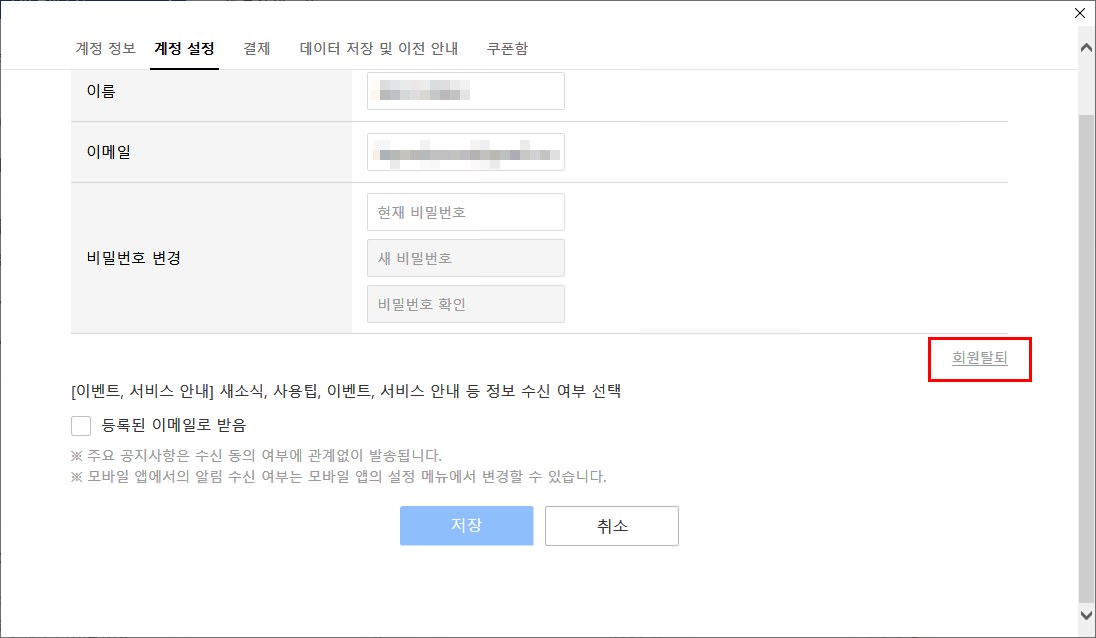 혹시 아래의 화면에서 비밀번호를 설정하라는 창이 뜰 수도 있습니다. 그런 경우, 비밀번호를 설정하고 다시 재접속한 뒤 회원탈퇴를 클릭하면 됩니다.
