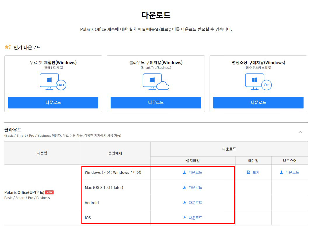 다운로드 페이지에서 Polaris Office(클라우드) 버전에서 각 운영체제에 맞는 설치파일을 무료로 다운로드 받을 수 있으며, Windows를 비롯한 MAC(OS X 10.11 later), 안드로이드, iOS 등 모든 운영기기를 지원합니다.