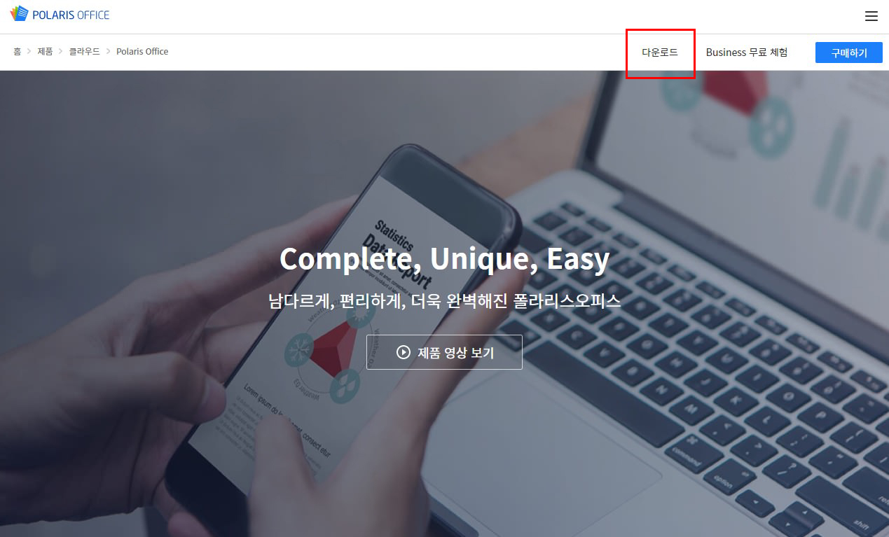 폴라리스 오피스 홈페이지 상단의 다운로드 메뉴를 클릭해 주세요.