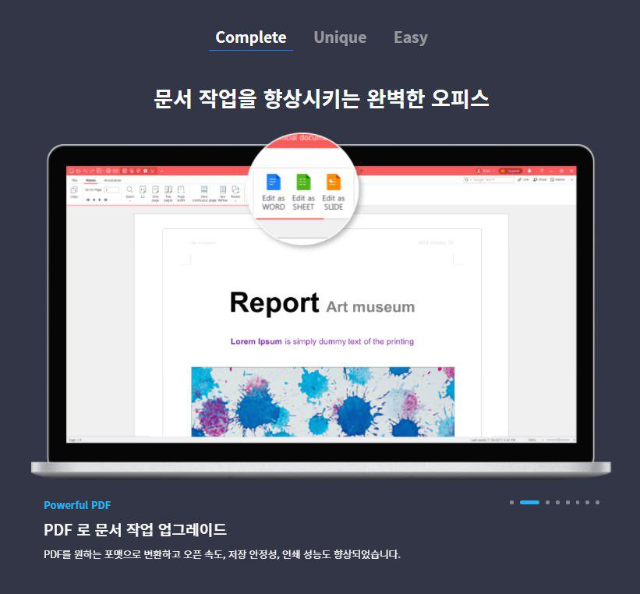 폴라리스 오피스에서는 PDF파일을 워드나 파워포인트, 엑셀파일 등 원하는 포맷으로 변환이 가능하며, 폴라리스 오피스 내에서 변환이 바로 되기 때문에 변환속도나 변환의 완성도도 굉장히 높은 편입니다.
