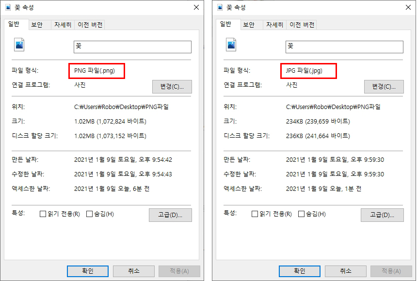 7) 변환하기 전 PNG파일과 변환한 후 JPG파일의 속성을 비교해보면 파일 형식이 변환이 된 것을 확인할 수 있습니다.