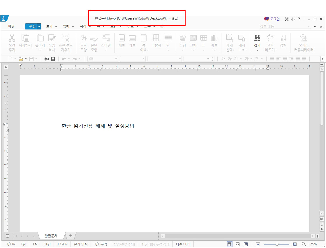 4) 다시 한글파일을 열어보면 읽기전용 표시가 사라지고, 파일편집과 수정이 가능한 상태가 됩니다.