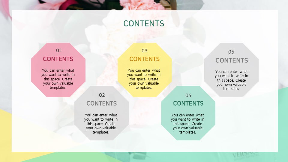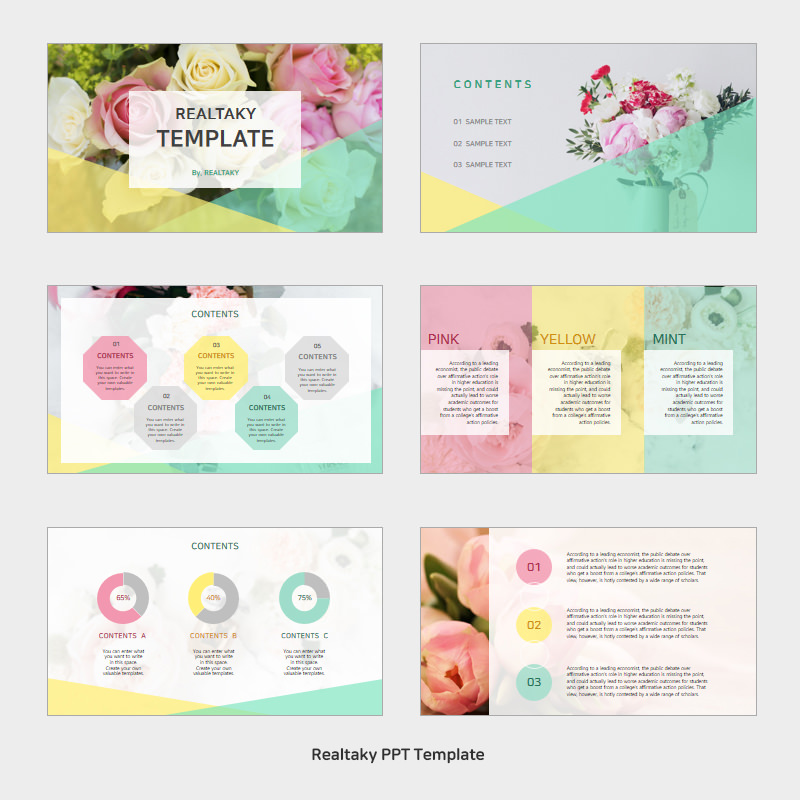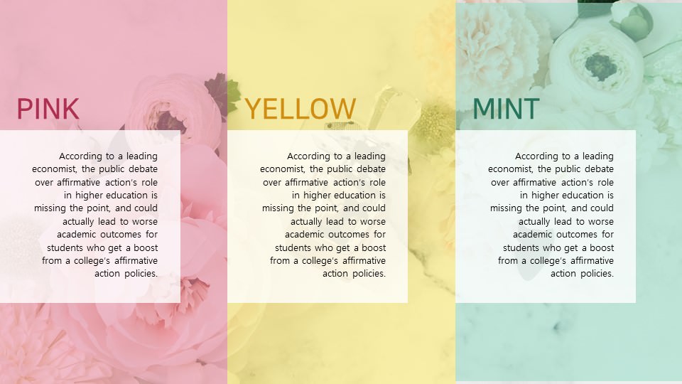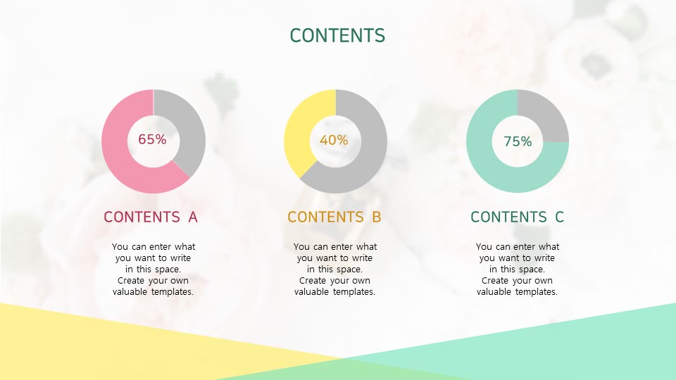 보기만 해도 살랑살랑 꽃향기가 느껴질 것 같은 파스텔톤의 꽃PPT템플릿입니다. 밝은 옐로우와 민트, 핑크 3가지 색상 조합으로 여성스러운 청순함이 느껴집니다.