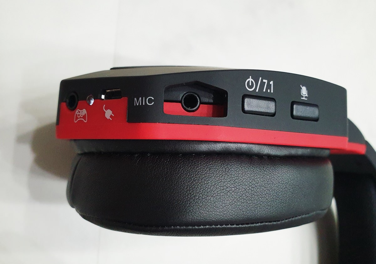 헤드셋 오른쪽 부분입니다. 스테레오 케이블 단자와 5pin 전원충전 단자, 마이크단자, 전원버튼, 음소거 버튼이 있습니다. 충천 방식이 마이크로 5핀이라서 스마트폰 충전기를 사용하여 충전도 가능합니다.