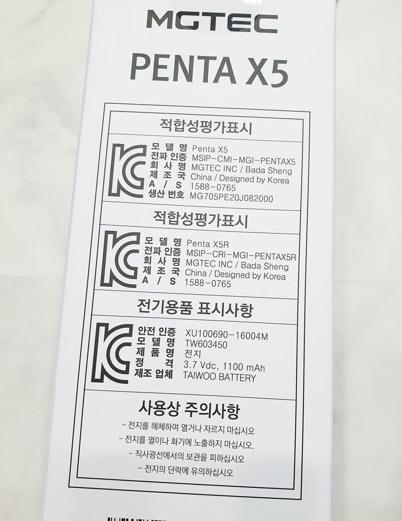 적합성 평가표시에 정확한 모델명은 Penta X5R이라고 표기되어 있네요? 그냥 편하게 펜타X5라고 하겠습니다.