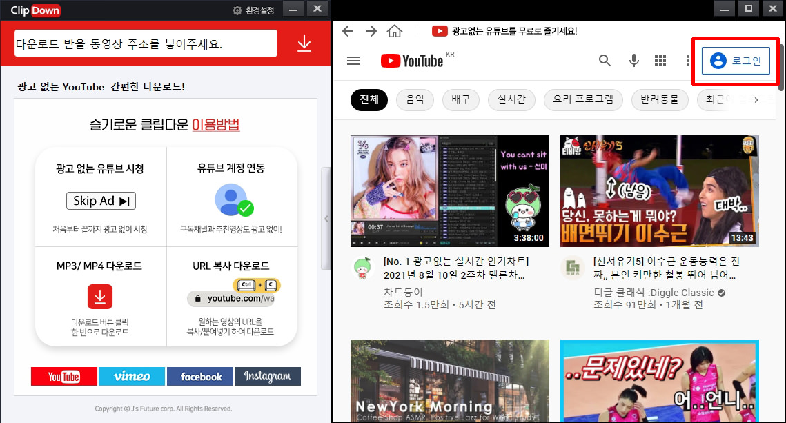 설치가 완료된 Clipdown 프로그램을 실행하면 아래와 같이 창이 뜨는데, 오른쪽 로그인 버튼을 눌러 유튜브에 연결해 놓으면, 평소에 자신이 구독이나 좋아요 눌렀던 채널들이 쭉 뜨면서 편하게 영상을 찾을 수 있습니다.