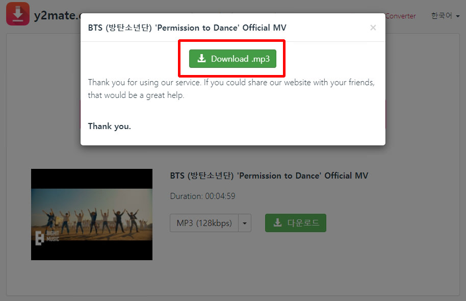 클립다운과 마찬가지로 방탄소년단의 공식 뮤비를 붙여넣기 했는데, 썸네일이 뜨고 파일형식과 다운로드 버튼이 뜹니다. MP3혹은 MP4 중에서 선택이 가능하며, 다운로드 버튼을 누르면 다운로드가 진행됩니다.