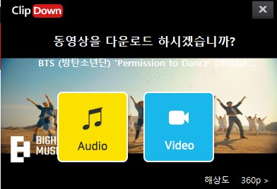 저는 방탄소년단의 퍼미션 투 댄스 뮤직비디오의 주소를 넣어봤는데, 썸네일이 뜨고 오디오, 비디오 중에 다운로드 받고 싶은 형식을 선택하면 유튜브 다운로드가 진행됩니다.