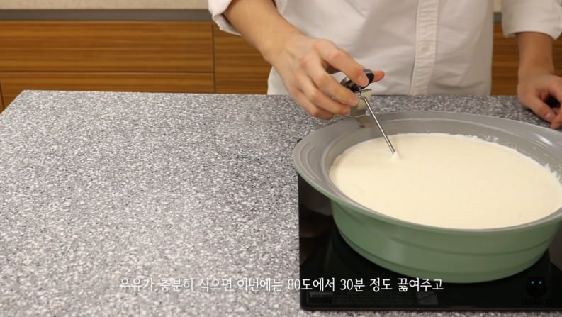 우유가 다 식었으면 다시 80도에서 30분을 끓여줍니다.