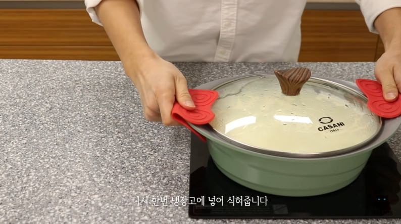 우유가 식으면 냉장고에 넣어 24시간 정도 굳혀주세요.