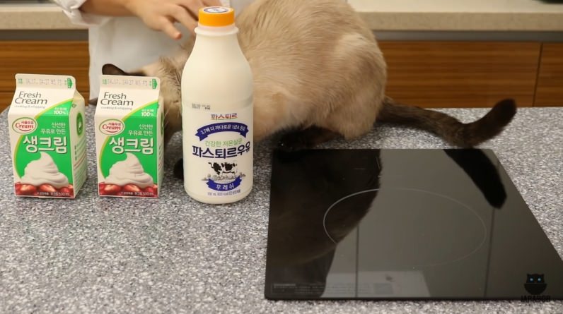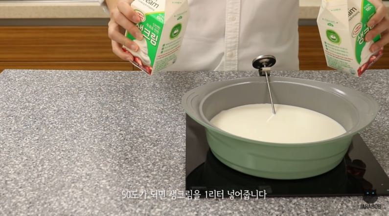 온도계 온도가 50가 되면 생크림 1리터를 넣어주세요.