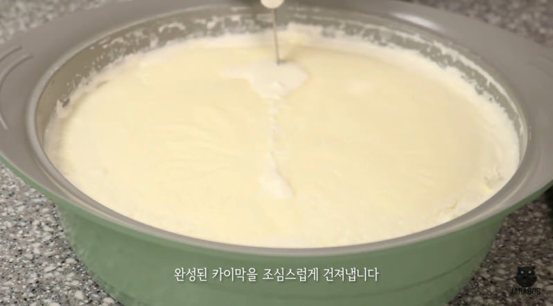 냄비 위에 떠 있는 카이막만 조심스럽게 건져내 주세요.