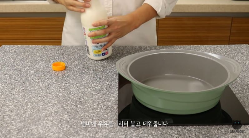 냄비에 우유 1리터를 붓고 낮은 불에서 데워줍니다.